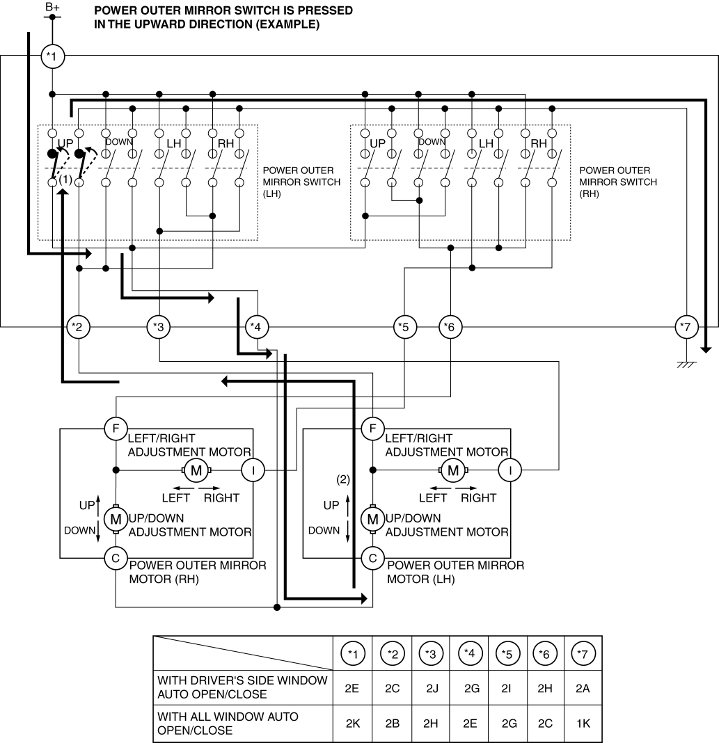 1. When the upward switch is turned on (1), the up/down adjustment motor operates upward.(2)