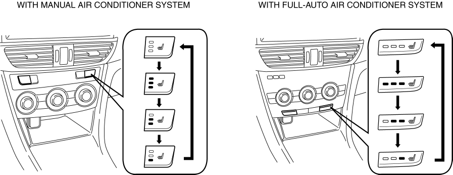 Ex.) Seat warmer temperature level on cloth-type front passenger-seat is set at 3 (with manual air conditioner system):