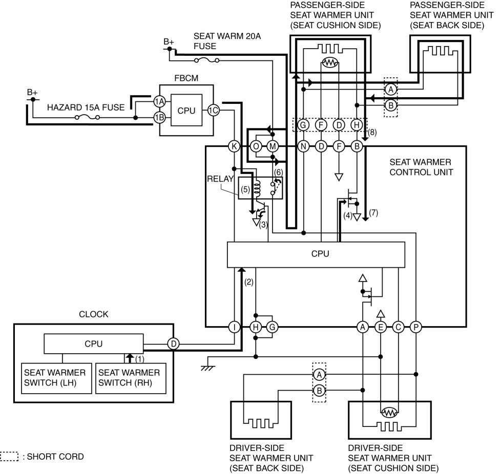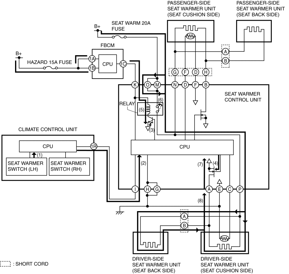 7. When the relay switch built into the seat warmer control unit turns on and the FET circuit is completed, the front passenger’s seat warmer unit circuit is completed (8) and the front passenger’s seat cushion and seat back warm up.