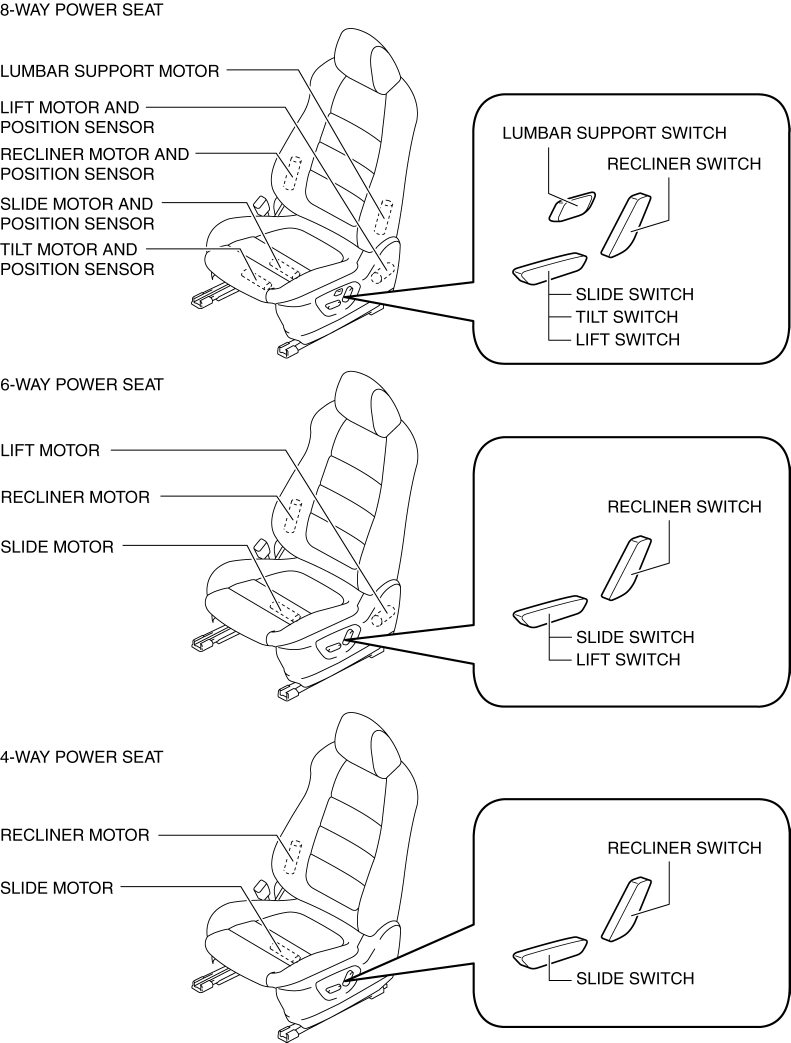 The power seat system drives the electric motor, operates the front seats safely, and changes the driving posture to suit the occupant by operating the power seat switch.