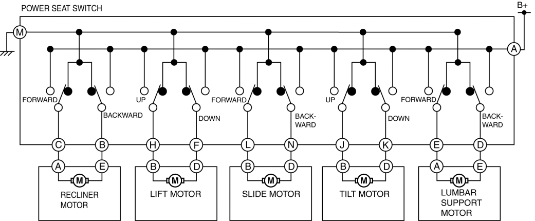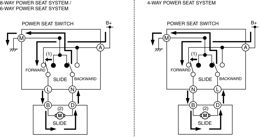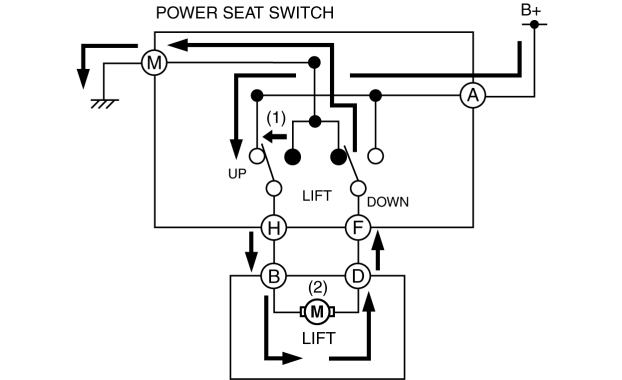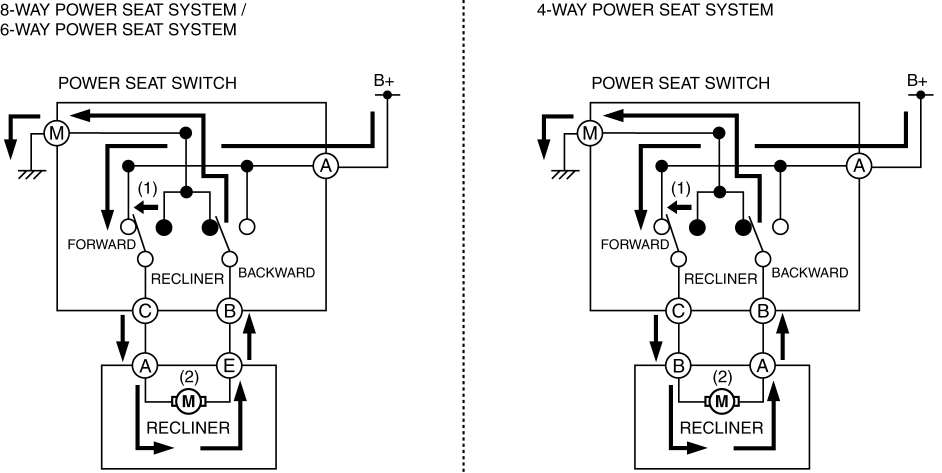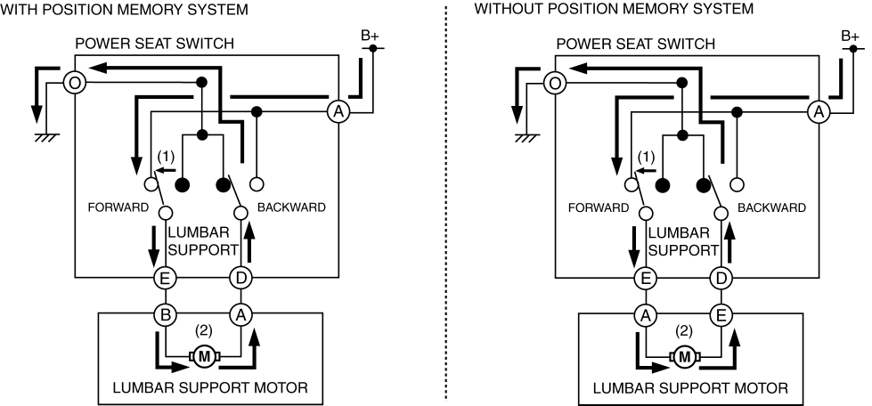 When the lumbar support switch is operated (1) forward, current from the battery flows (2) to the lumbar support motor.