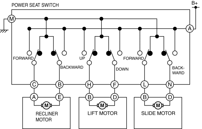 When current flows to the slide motor and position sensor for forward motion, the motor drives to slide the front seat forward.