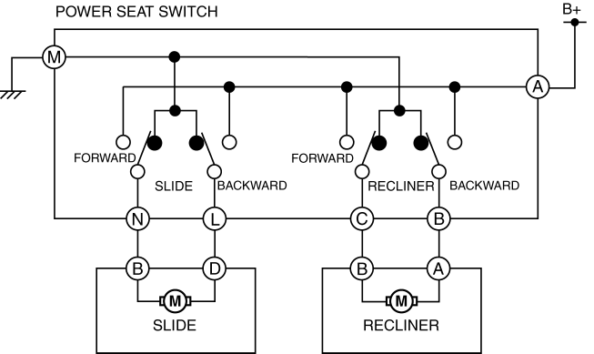 When current flows to the recliner motor for forward motion, the motor drives to tilt the front seat back forward.