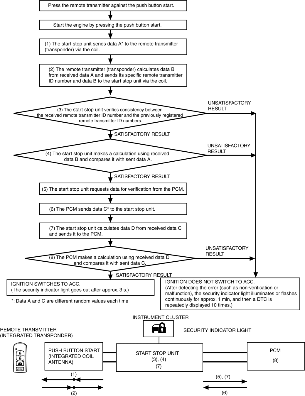 The immobilizer system-related parts programmed to the immobilizer system have a programmed key ID number, and starting the engine is only permitted when the key ID number matches.