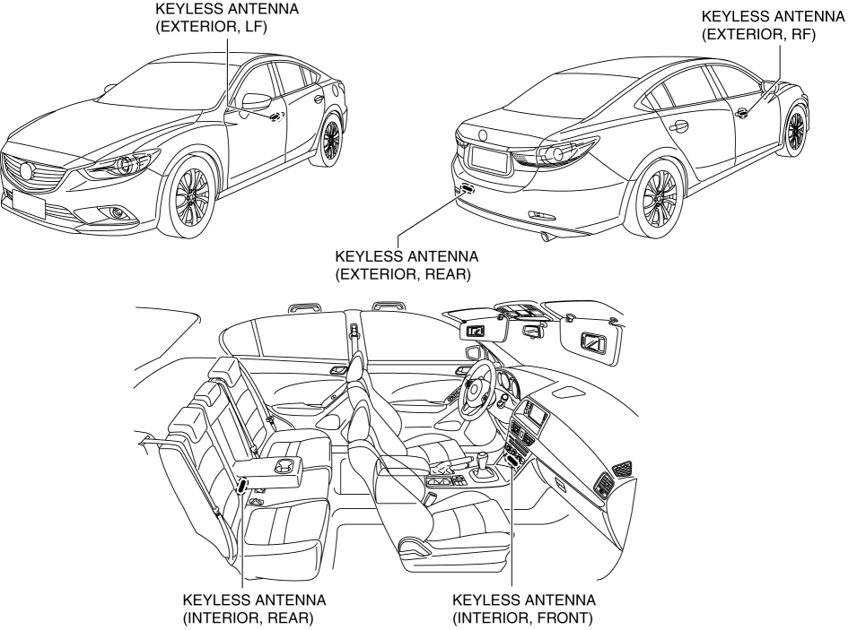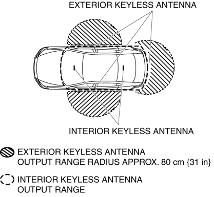 The keyless antennas for the vehicle exterior (driver-side, passenger-side, rear) form the request signal output area in the range of an approx. 80 cm {31 in} radius from each location and communicate with the advanced key.