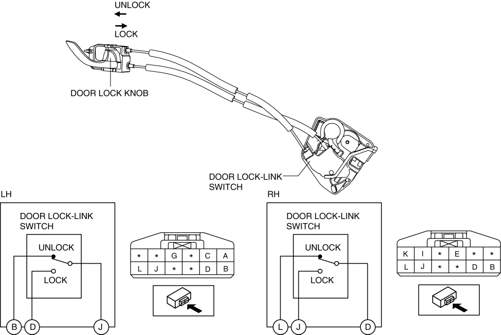 The door lock-link switch contact point changes in conjunction with the rear door lock knob lock/unlock operation.