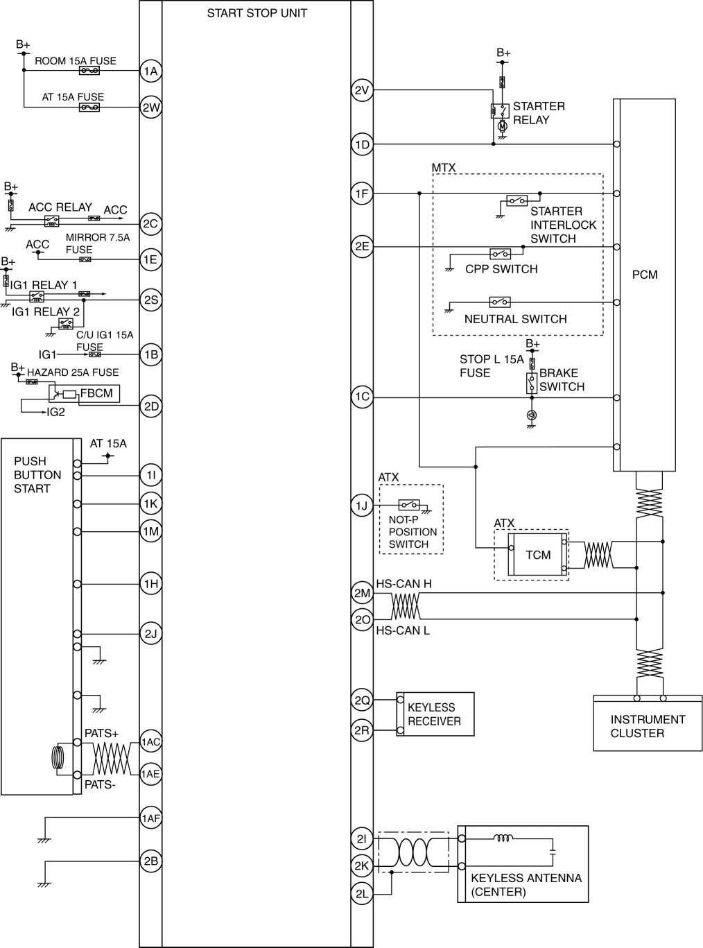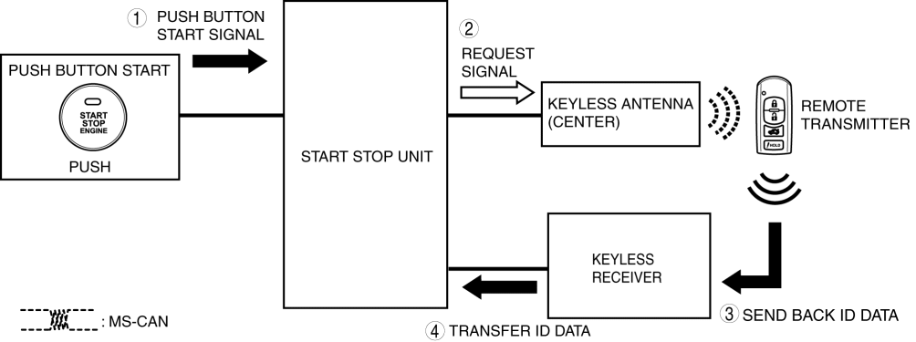 2. When the start stop unit detects a push button start signal, it sends a request signal via the keyless antennas.