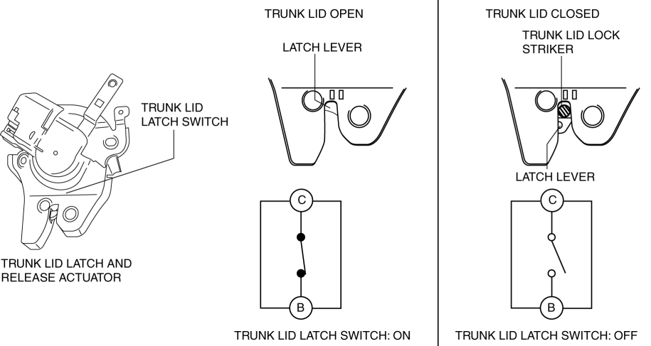 3. When the trunk lid is completely closed, the latch lever is in the latched condition pressing the trunk lid latch switch, which turns the switch off.