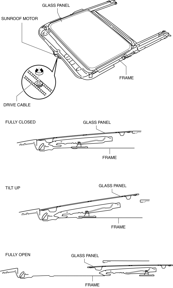 The glass panel tilts up/down or slides open/closed by the operation of the sunroof unit.