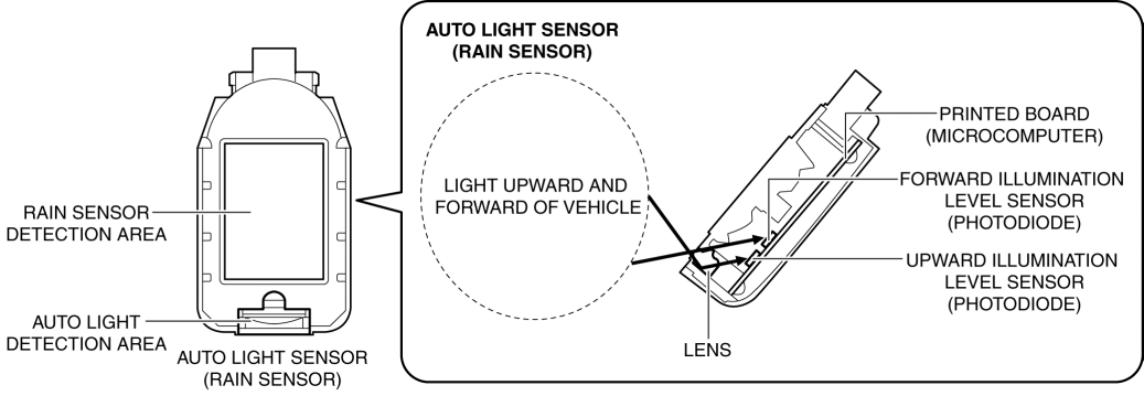 The auto light sensor consists of the lens, forward illumination level sensor (photodiode), upward illumination level sensor (photodiode), and microcomputer.