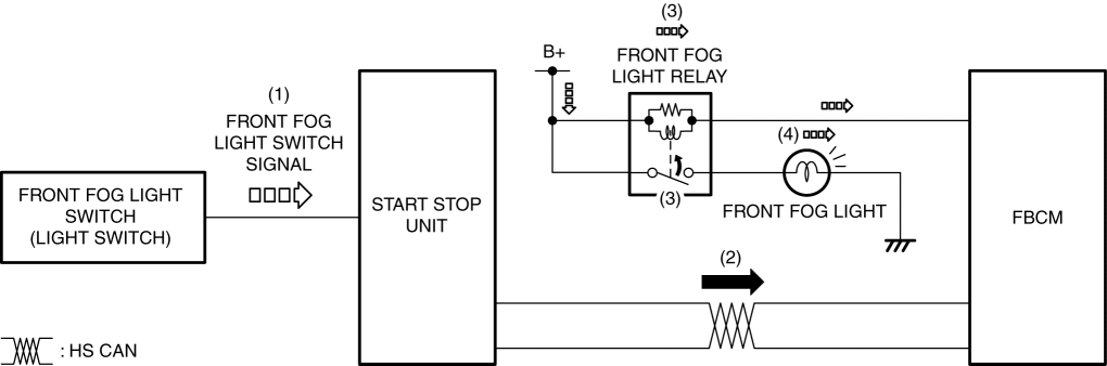 1. With the light switch in the TNS, HEAD, or HI position, a front fog light switch signal is sent to the start stop unit when the fog light switch is operated to the F.FOG position.