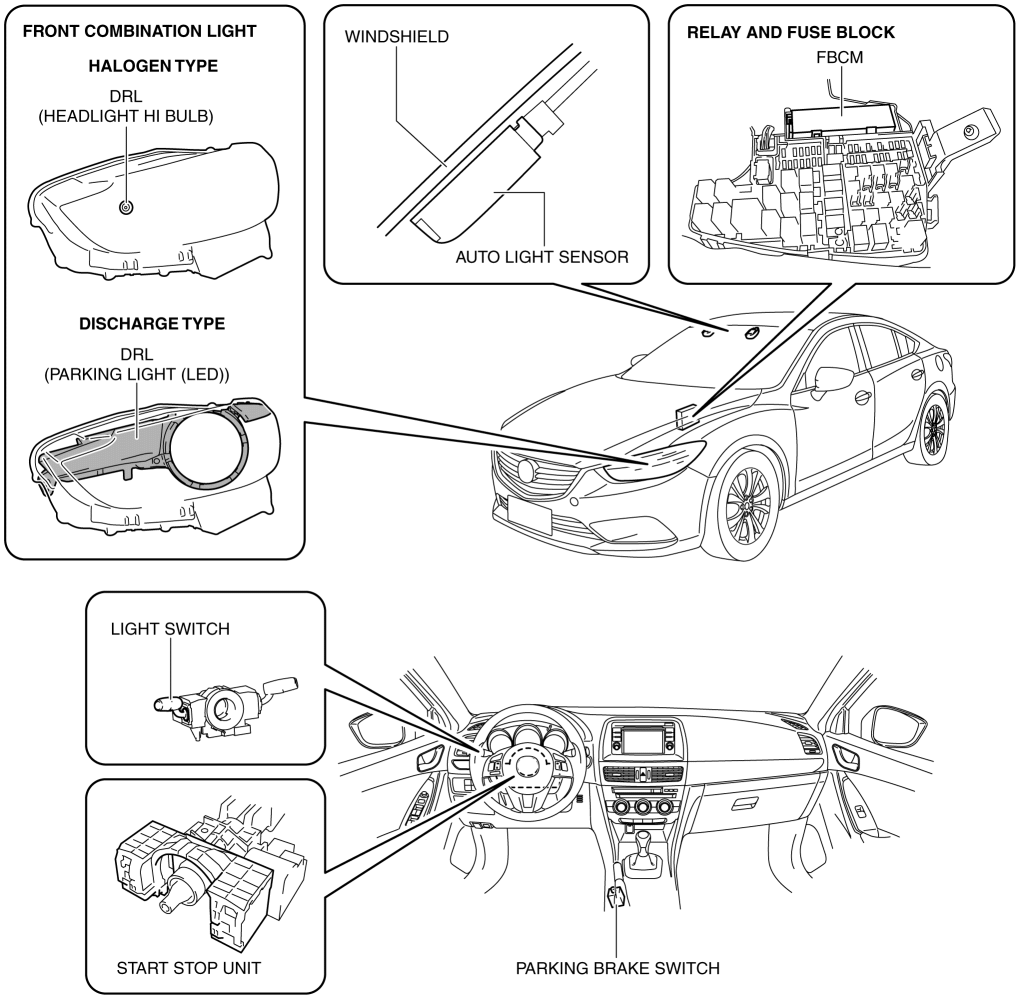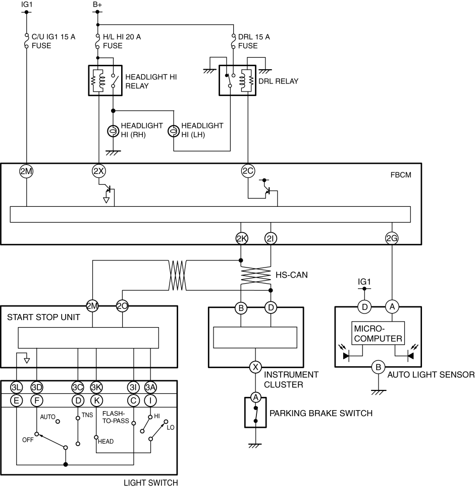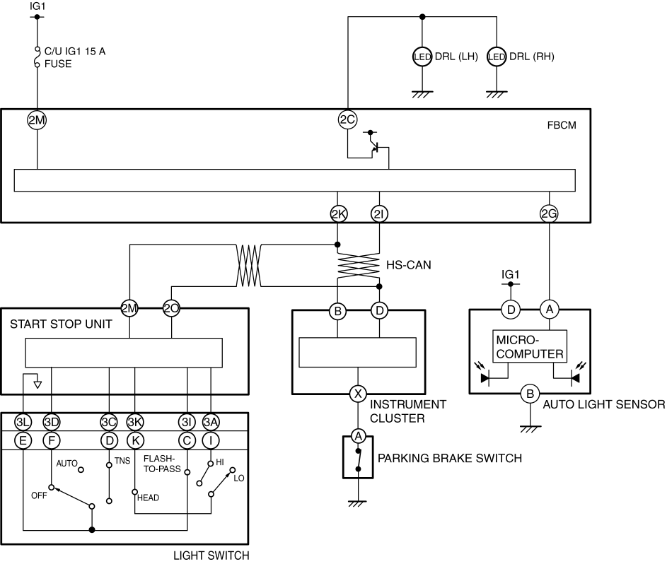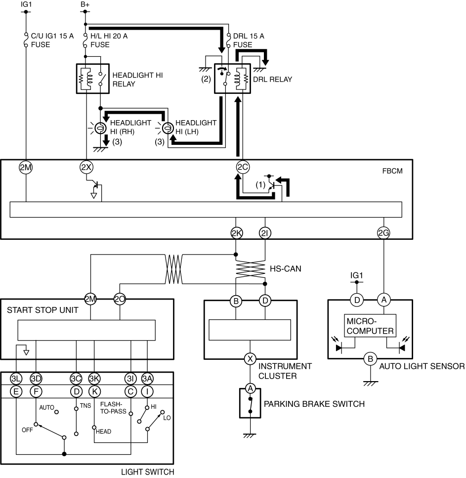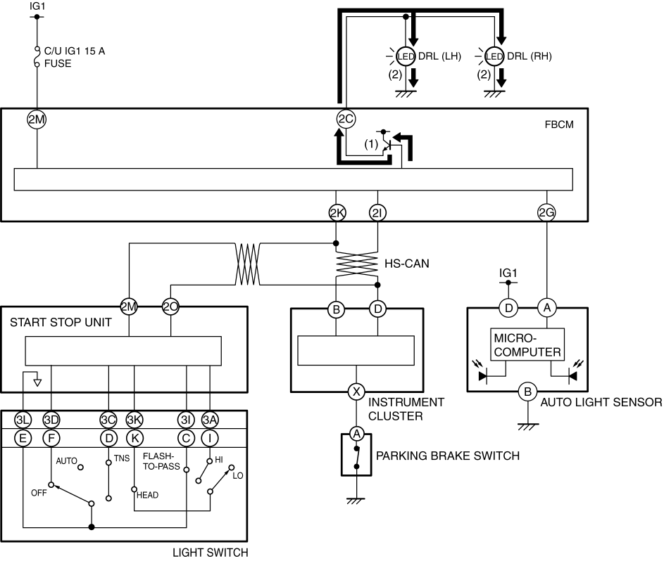 1. If the operation conditions are met, the front body control module (FBCM) turns on the DRL circuit transistor.
