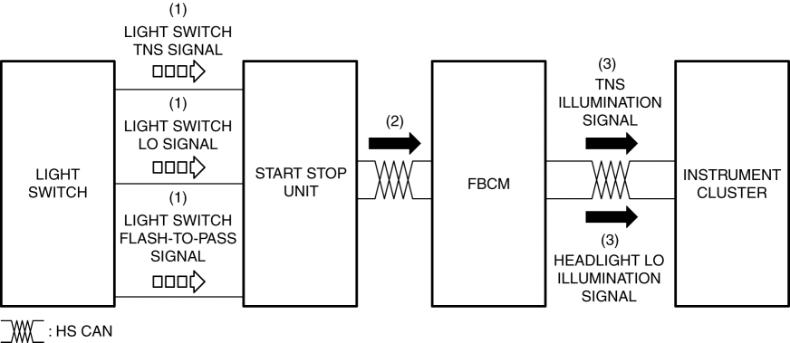 1. When the light switch is operated to the TNS, HEAD, or FLASH-TO-PASS position, a light switch TNS, LO, or FLASH-TO-PASS signal is sent to the start stop unit.