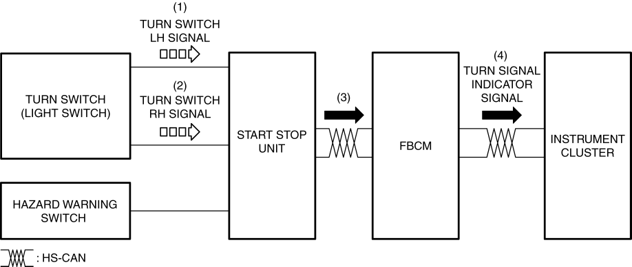 4. The front body control module (FBCM) sends the turn switch RH or LH signal to the instrument cluster as a turn signal indicator signal.