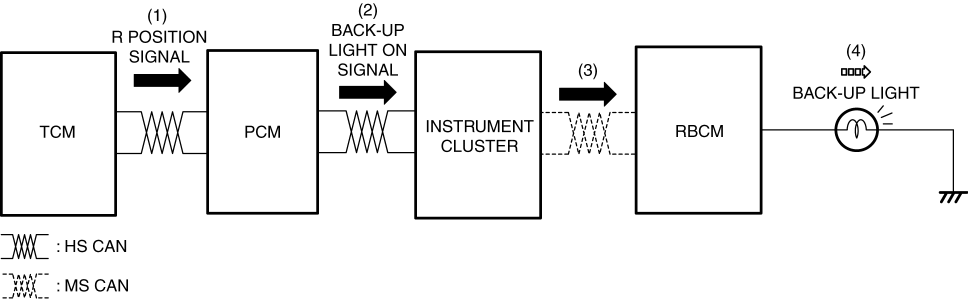 2. When the PCM receives the R position signal, it sends a back-up light on signal to the instrument cluster.