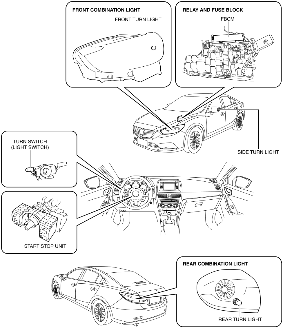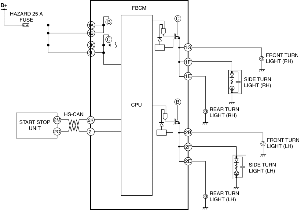 The front body control module (FBCM) performs control based on the turn switch LH or RH signal sent from the start stop unit via the CAN signal as follows: