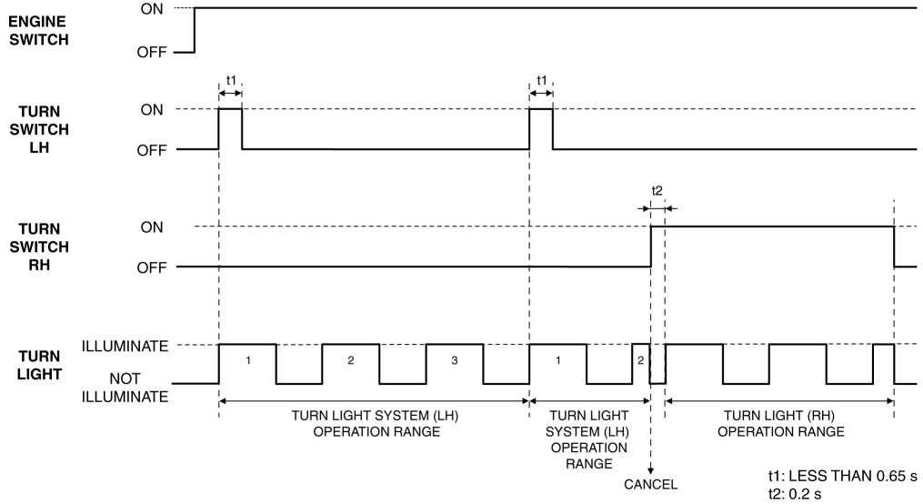 While the turn light system is operating, if the front body control module (FBCM) receives a turn switch on signal from the opposite side, the turn light system is cancelled. However, if the front body control module (FBCM) receives the turn switch on signal from the opposite side for 0.2 s or more, it flashes the turn lights while receiving the turn switch on signal.