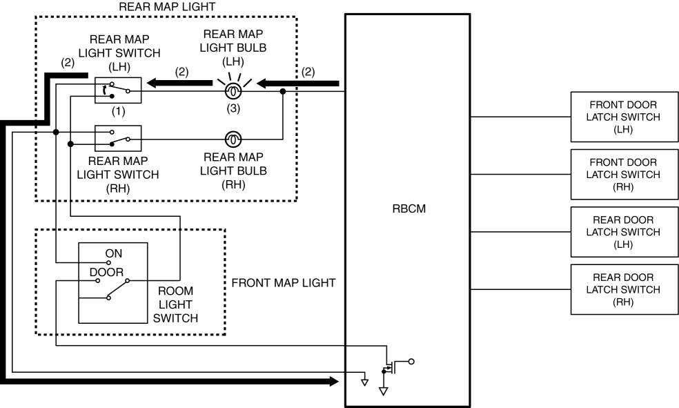 2. The battery current flows to the rear map light bulb from the rear body control module (RBCM).