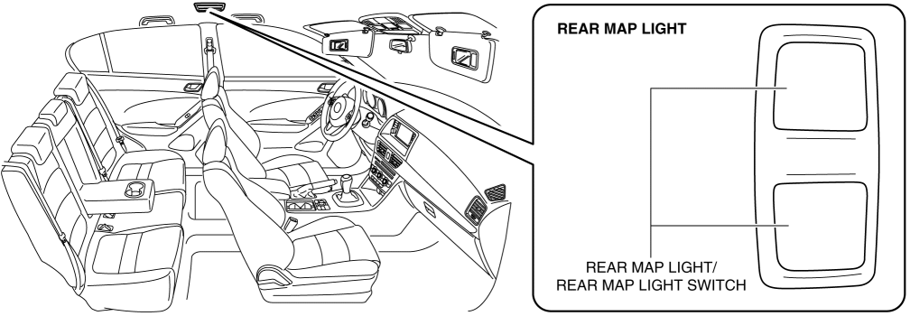 The rear map lights illuminate according to the lock condition of the driver's door and open/close conditions of the doors under the rear body control module (RBCM) control when the room light switch for front map light is in the DOOR position.
