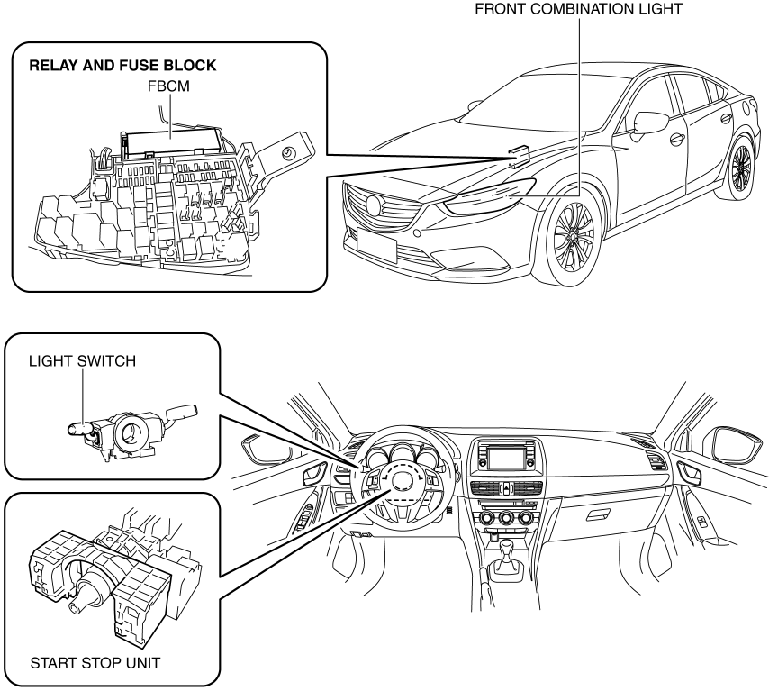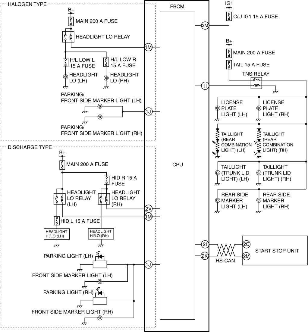 1. When the front body control module (FBCM) receives a light switch TNS or HEAD signal from the start stop unit with the ignition switched to ACC or OFF, the TNS or headlights are turned on and counting of the illumination time begins.