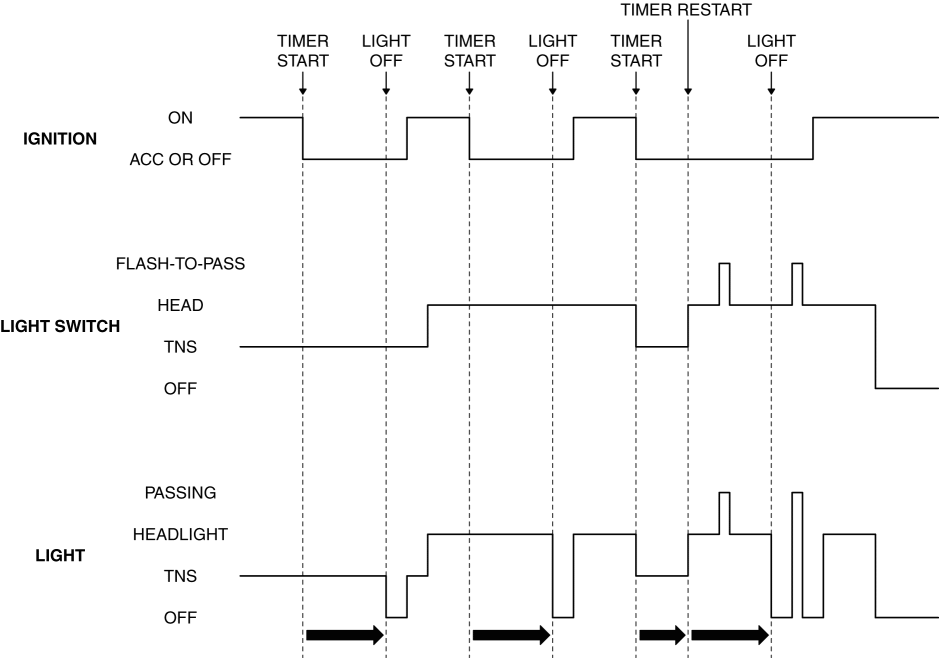If the front body control module (FBCM) detects that the ignition is switched off when the TNS and headlights are turned on, the TNS and headlights are turned on for a certain period of time and turned off after a certain period of time has elapsed.
