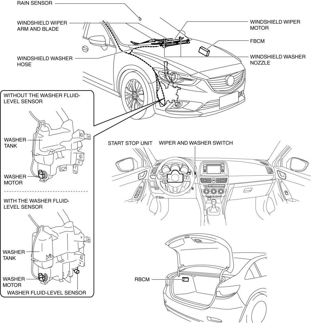 Windshield wiper/washer system with continuous (low/high), auto-stop, one-touch wiper, intermittent wiper, and synchronized washer and wiper operation adopted.