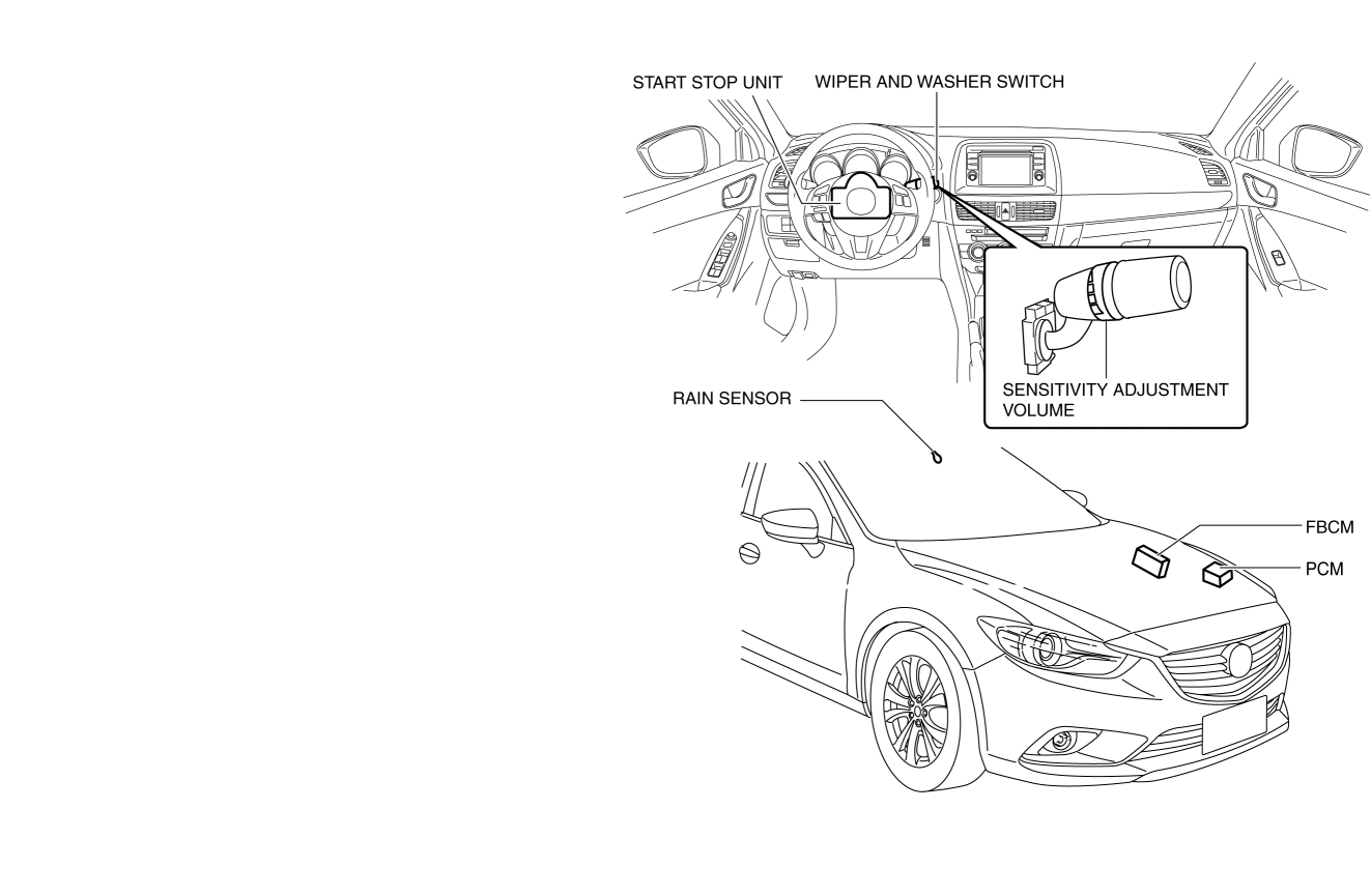 The sensitivity adjustment function can be used to adjust the rain sensor rain detection sensitivity by operating of the wiper and washer switch sensitivity adjustment volume.