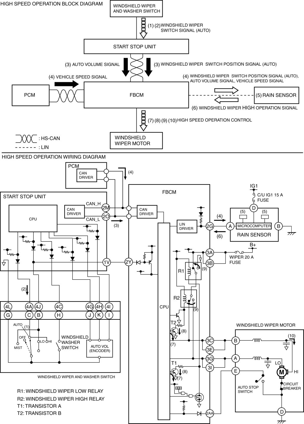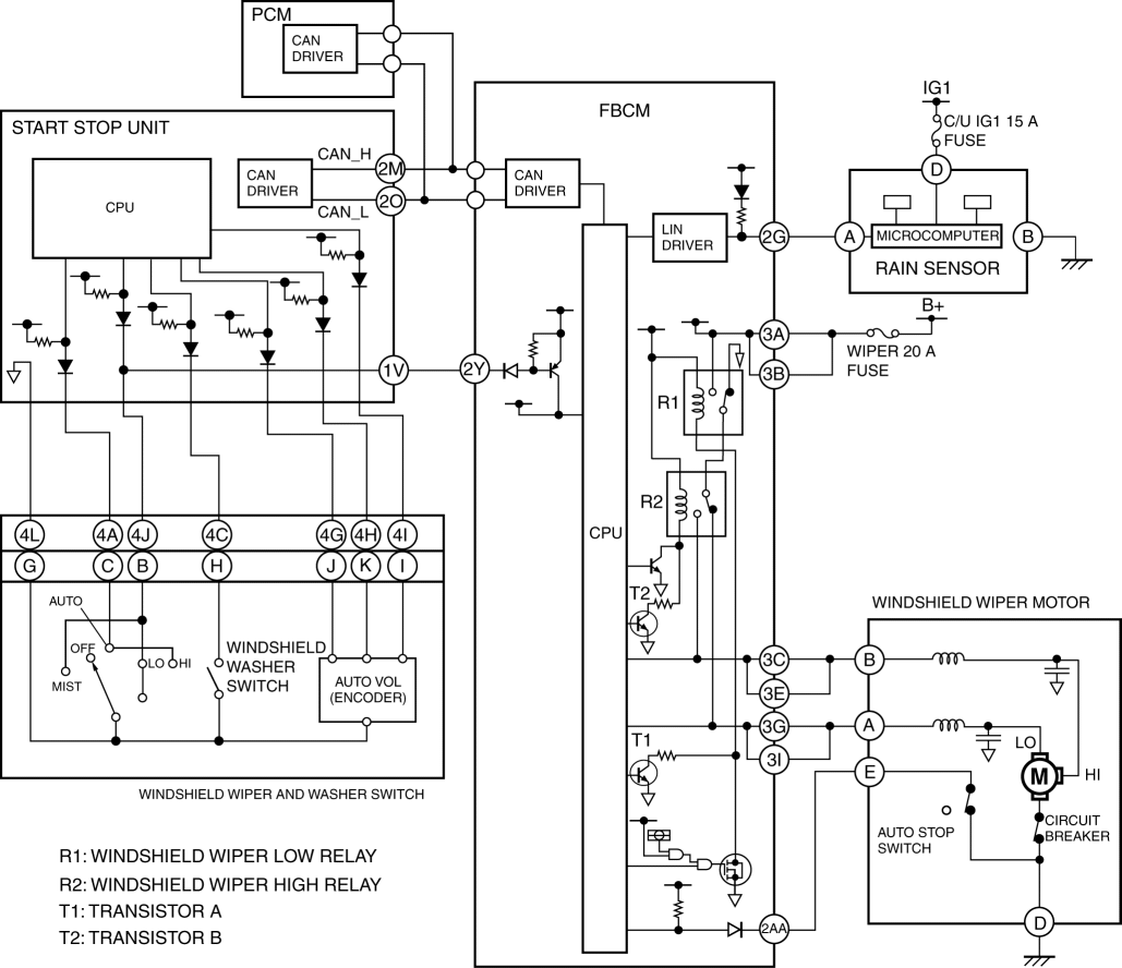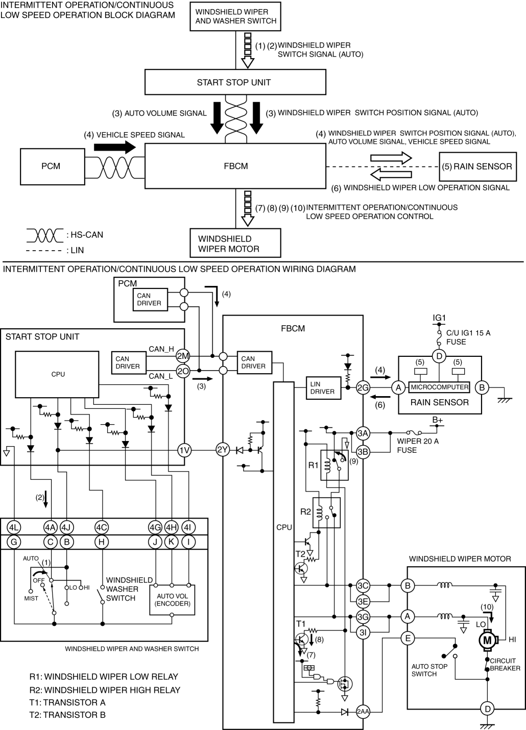 2. When the start stop unit detects the windshield wiper switch signal (AUTO), it sends a windshield wiper switch position signal (AUTO) and an AUTO volume signal to the front body control module (FBCM) as CAN signals (3).