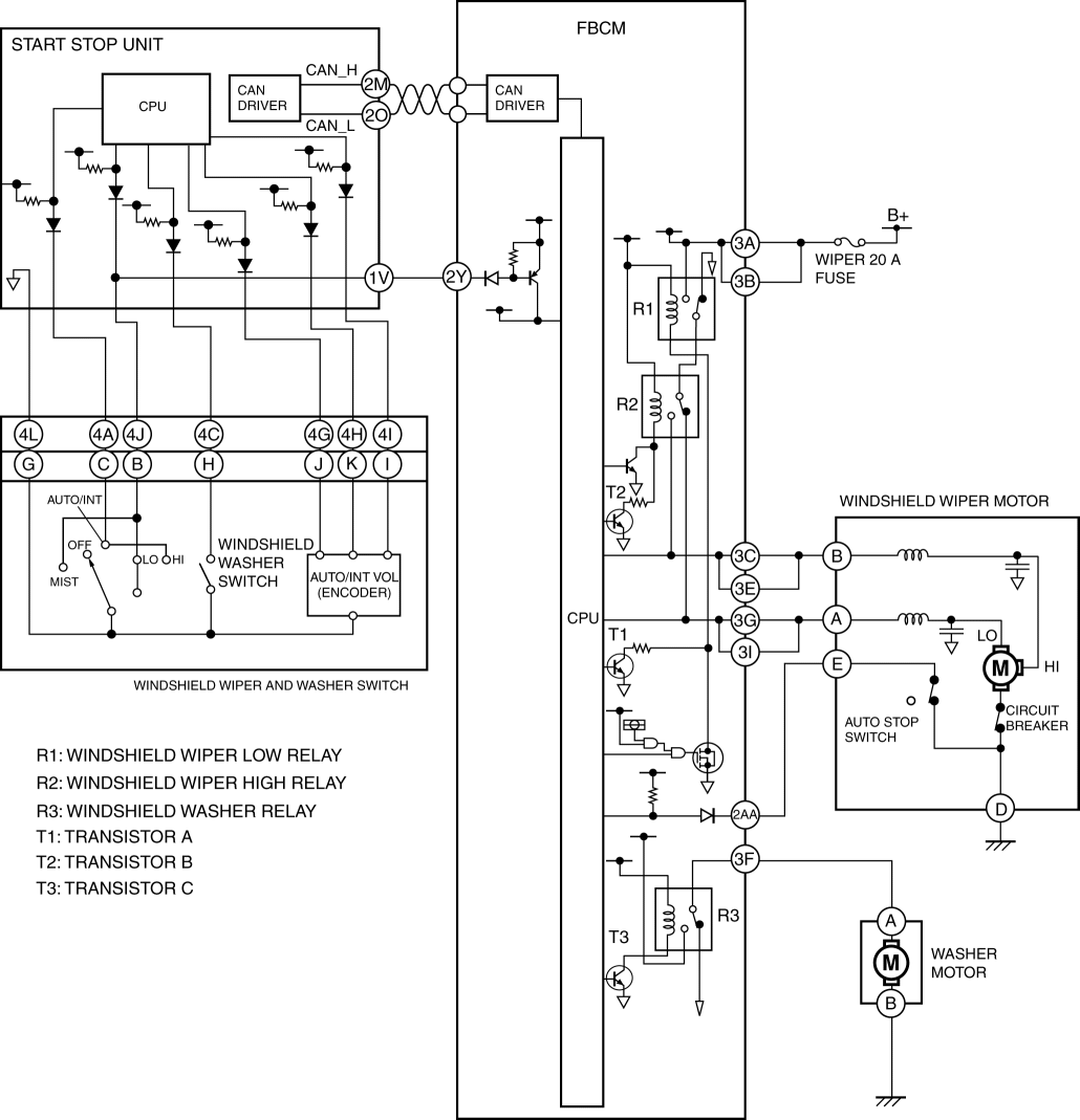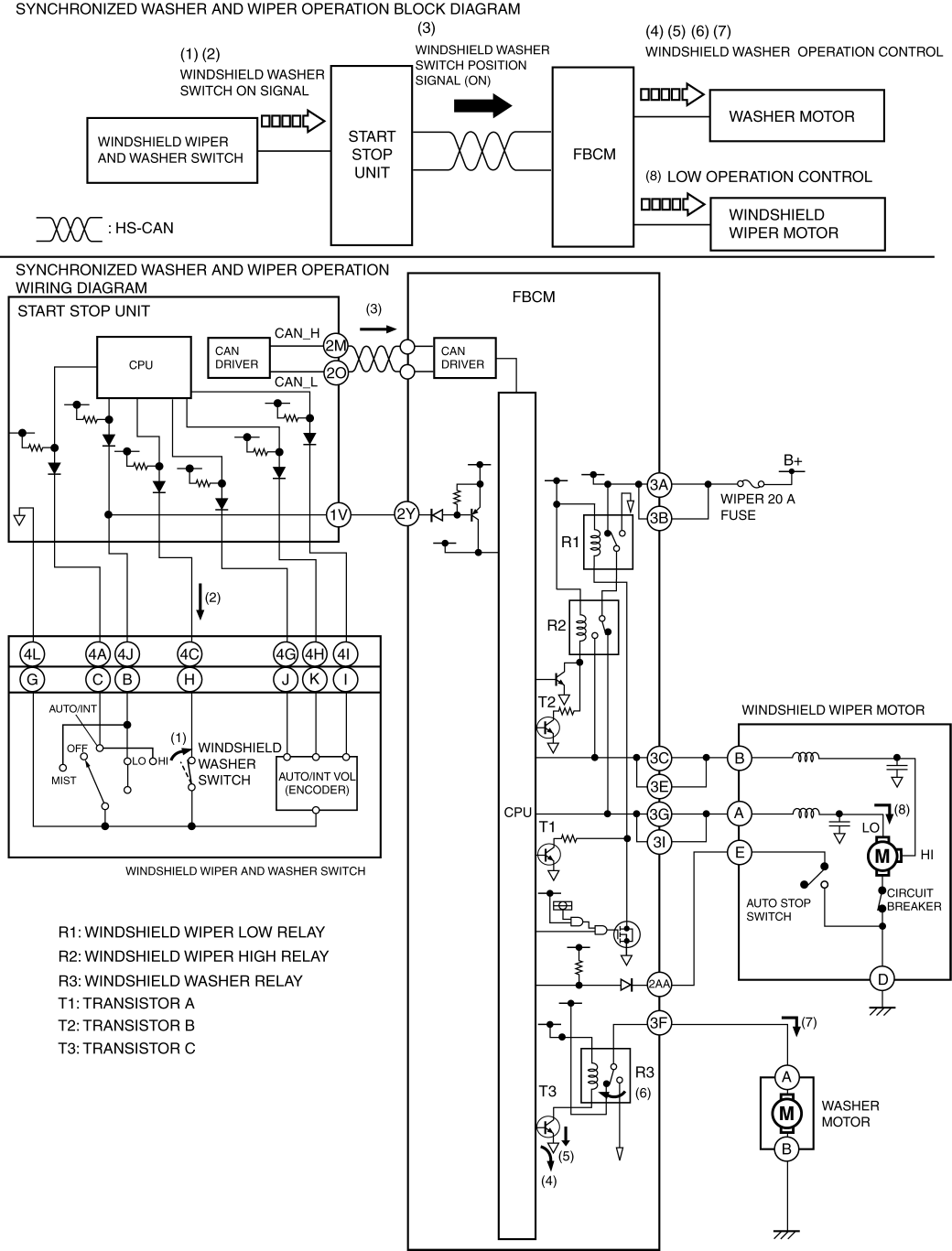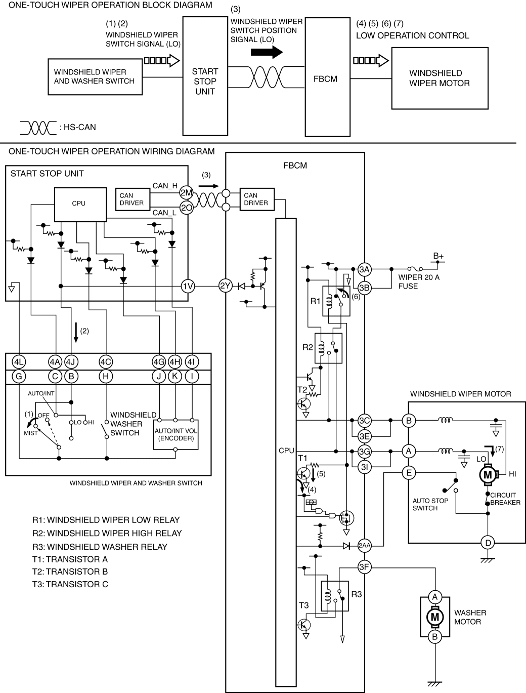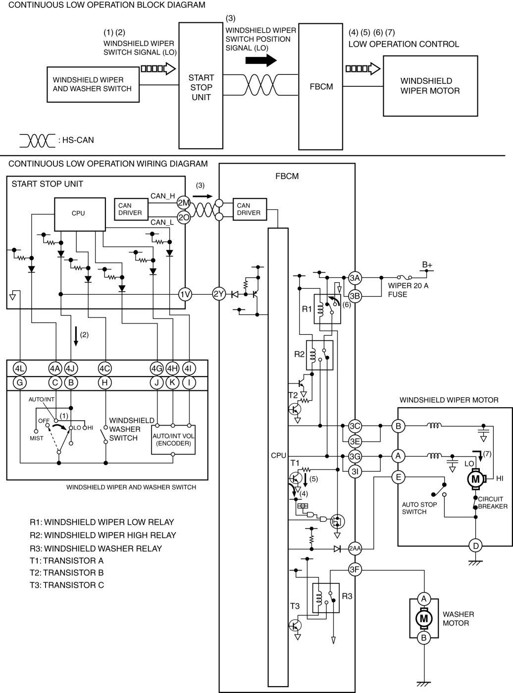 2. When the start stop unit detects the windshield wiper switch signal (LO), it send a windshield wiper switch position signal (LO) to the front body control module (FBCM) as a CAN signal (3).