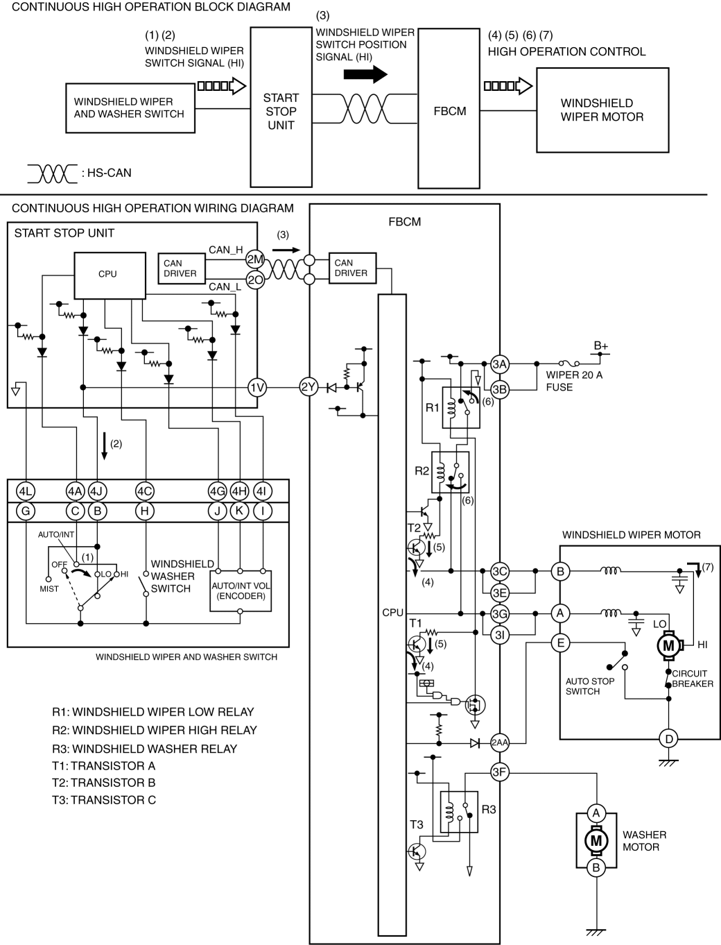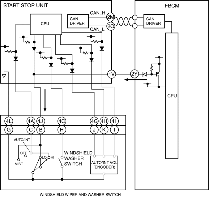 2. When the start stop unit detects a windshield wiper switch signal (HI), it sends a windshield wiper switch position signal (HI) to the front body control module (FBCM) as a CAN signal (3).