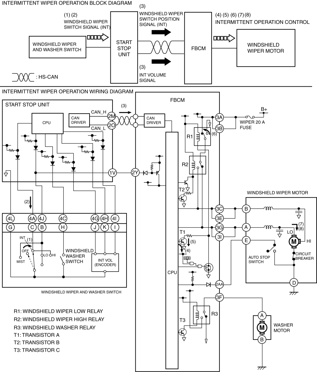 2. When the start stop unit detects a windshield wiper switch signal (INT), it sends a windshield wiper switch position signal (INT) and an INT volume signal to the front body control module (FBCM) as CAN signals (3).