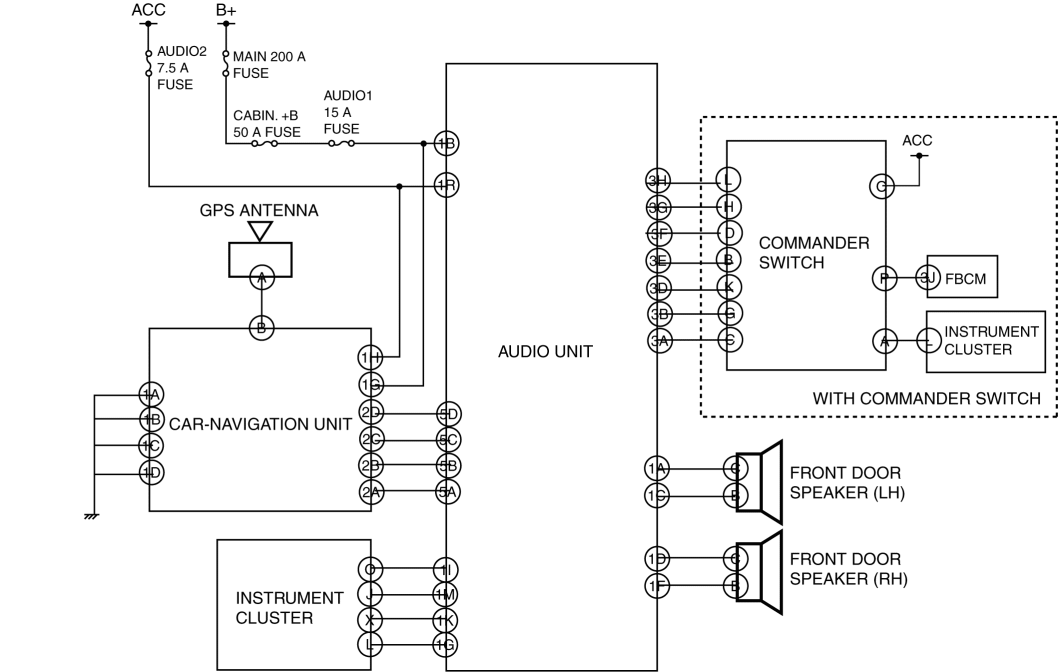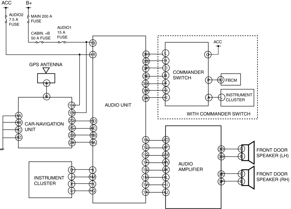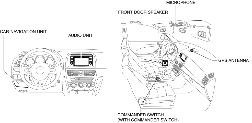 The car-navigation system consists of the car-navigation unit, audio unit, command switch, GPS antenna, microphone, and speakers.