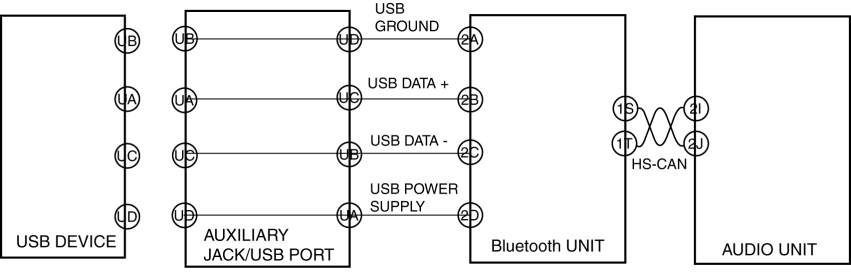 When the Bluetooth unit receives the USB mode request signal from the audio unit, the Bluetooth unit sends the voice signal for the USB device/iPod to the audio unit via CAN communication.