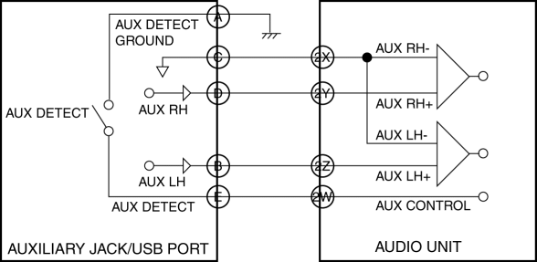 2. When the audio unit is switched to AUX mode using the AUX button of the audio panel switch (without color LCD)/display (with color LCD), the commander switch, or the voice recognition function, the audio unit outputs the audio signal sent from the auxiliary jack/USB port to the speakers.
