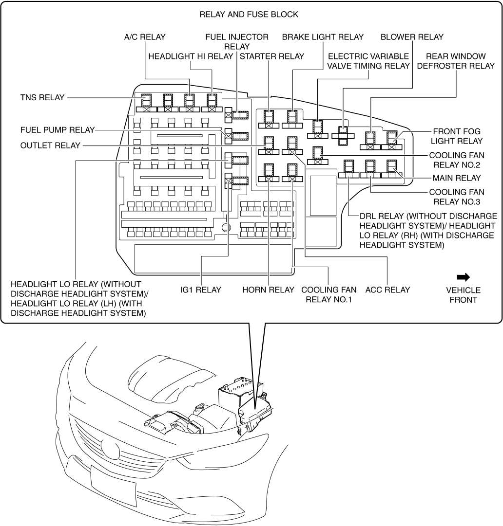 Relays and fuses used by each system are grouped and housed together.