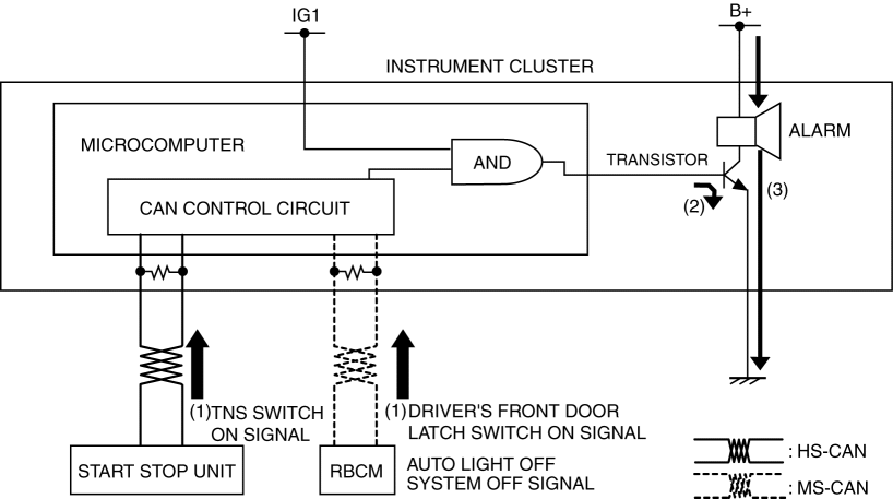 1. The instrument cluster receives (1) the TNS switch ON signal from the start stop unit and driver's front door latch switch ON signal and auto light OFF system OFF signal from the rear body control module (RBCM).
