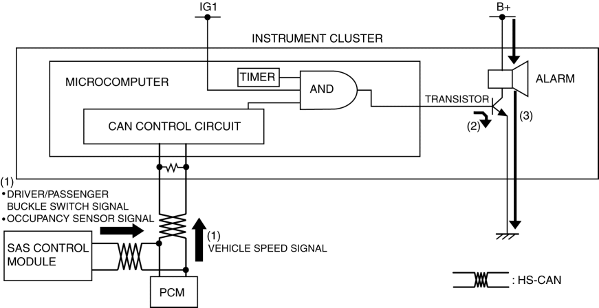 1. The instrument cluster receives (1) the vehicle speed signal from the PCM, the driver/passenger buckle switch signal and occupancy sensor signal from the SAS control module when the ignition is switched ON (engine off or on).
