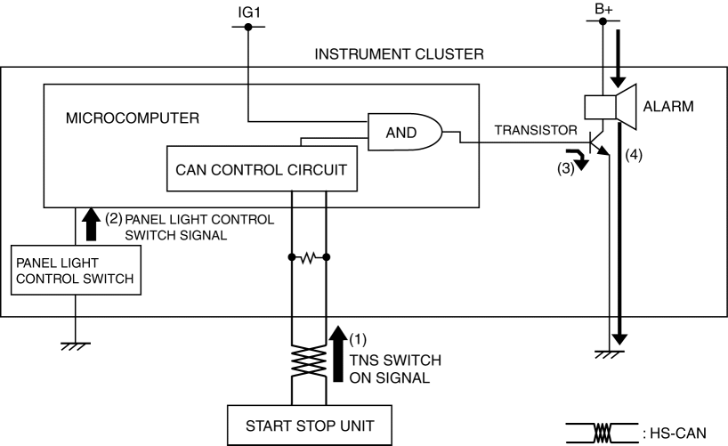 If the panel light control switch is in the maximum rotation position right or left when the TNS switch ON signal (TNS and headlights illuminate) sent from the start stop unit via the CAN signal is received, the instrument cluster sounds the panel light control indicator alarm.