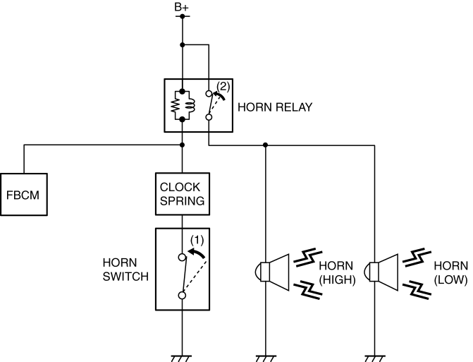 1. When the horn switch turns on (1), the horn relay turns on (2).