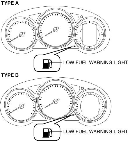 The Type A instrument cluster displays a warning message in the LCD simultaneously when the fuel tank level warning light illuminates. For details on the message, refer to the FUEL TANK LEVEL WARNING DISPLAY.