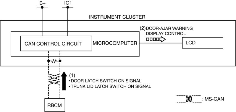 1. The instrument cluster receives (1) the door latch switch ON signal or trunk lid latch switch ON signal from the rear body control module (RBCM).