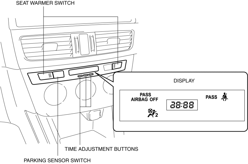 Consists of the display which displays the current time and indicator/warning lights, the time adjustment button, and the seat warmer switch (with seat warmer).