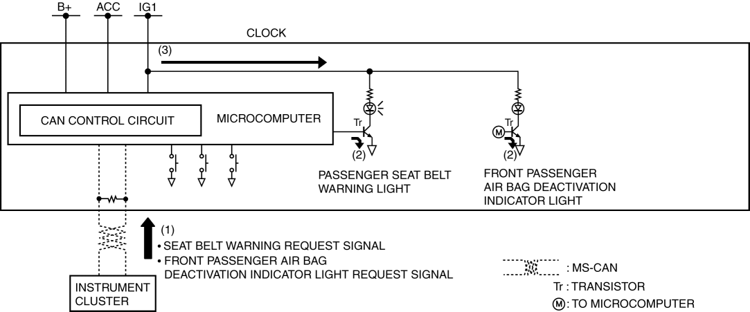 The clock receives (1) a seat belt warning request signal and front passenger air bag deactivation indicator light request signal from the instrument cluster.