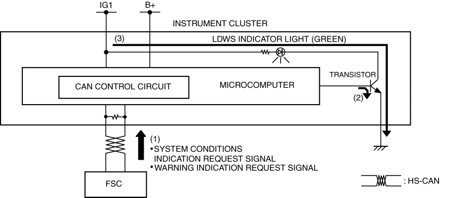 The instrument cluster flashes the LDWS indicator light (green) based on the warning indication request signal sent via a CAN signal from the FSC.