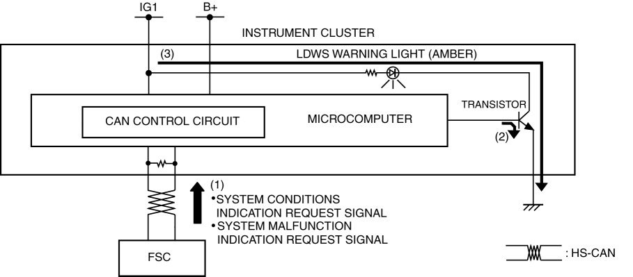 The instrument cluster illuminates the LDWS warning light (amber) based on the system condition display request signal sent via a CAN signal from the FSC.