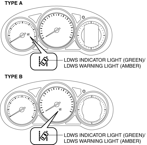 The LDWS indicator light (green) notifies the driver of the vehicle lane lines being recognized or that the vehicle may be departing from its lane.