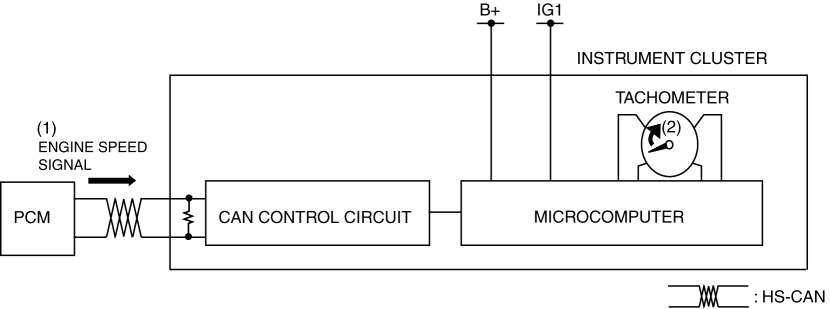 The instrument cluster controls the tachometer needle based on the engine speed signal from the PCM and displays the engine speed per minute.