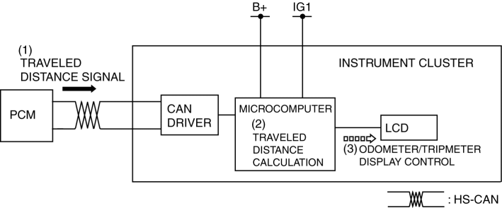 The instrument cluster receives (1) the traveled distance signal from the PCM when the ignition is switched ON (engine on).