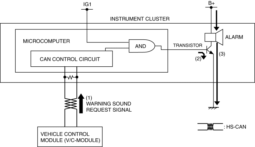 2. The instrument cluster turns the transistor on (2) based on the warning sound request signal.