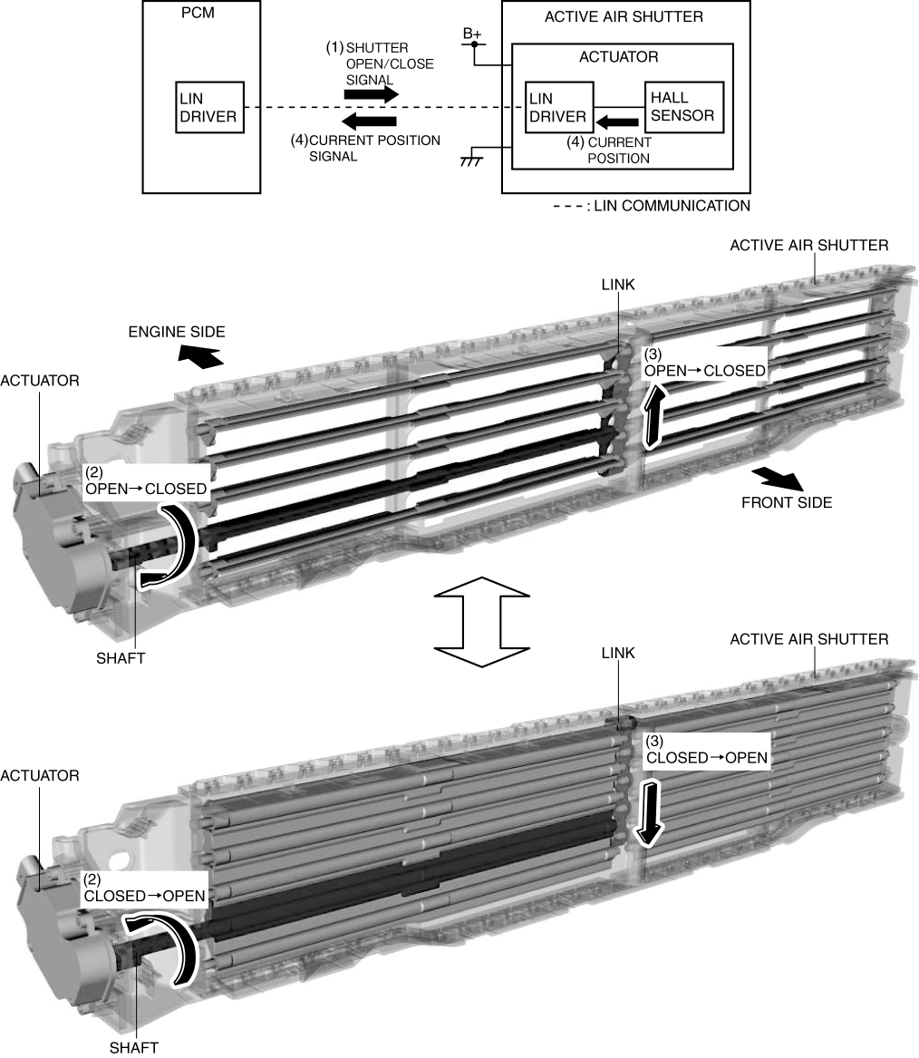 The active air shutter opens/closes the shutter based on the open/close signal from the PCM. In addition, the active air shutter sends the current position of the shutter to the PCM.
